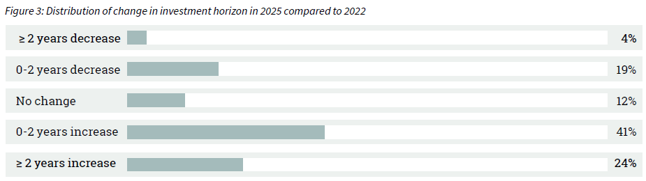 Figure 3 shows the distribution of responses on change in investment horizon. 41% of respondents report an increase in investment horizon between 0 and 2 years. 24% of respondents report an increase in investment horizon of 2 or more years. 4% of respondents notice a decrease in investment horizon of 2 or more years.
