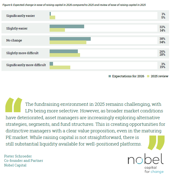 Factors such as inflation and high interest rates heavily impact the ability to raise capital. In 2025, 47% of PE professionals reported that raising capital had become slightly or even significantly more challenging compared to the previous year. The expectations for 2026 are mixed, 29% of respondents expect raising capital to become more difficult, while 33% expect it will become easier.