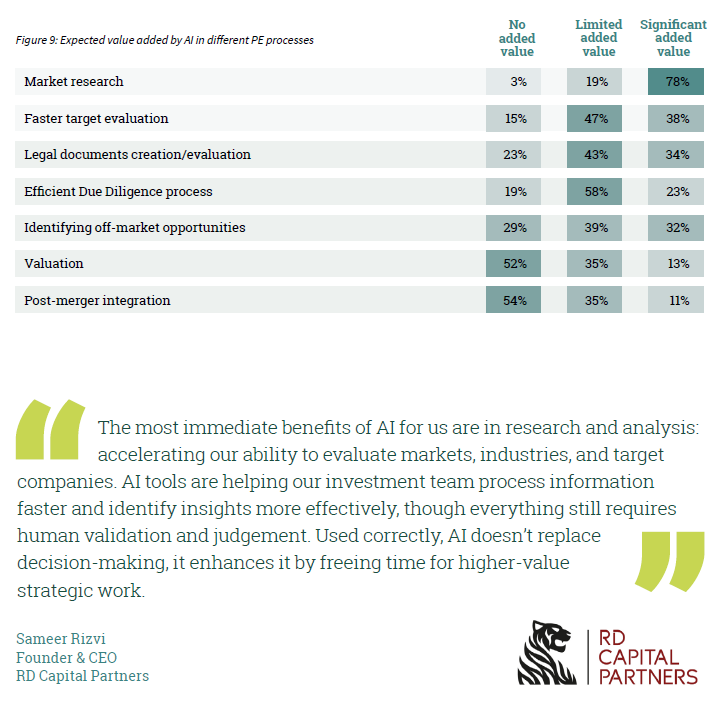 This shift shows that in just two years, AI has evolved from a niche tool to a widely embedded part of European mid-market M&A practices.