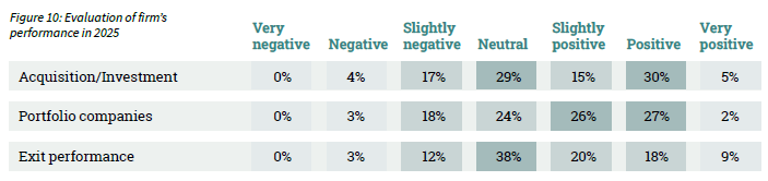Figure 11 shows the expectations for overall Private Equity performance in 2026. Sentiment toward portfolio companies performance is clearly optimistic, with 70% of respondents anticipating positive results. In total, 58% of respondents anticipate positive exit performance in 2026.
