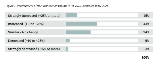 After years of disruption, uncertainty has become a constant in the M&A landscape. Yet in Southern Europe, the market shows signs of structural adaptation. Despite ongoing macroeconomic pressures, 58% of respondents reported an increase in transaction volume in H1-2025 compared to H2-2024, with 15% noting a strong increase of over 25%. Only 8% experienced a decline. This indicates growing resilience across the region, particularly in the SME segment, where dealmakers appear increasingly equipped to navigate volatility as part of the new normal.