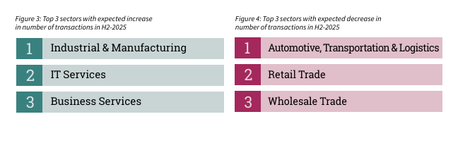 The number of expected transactions in a sector is influenced by a variety of market, industry, and f inancing-related factors. To gain insight into anticipated shifts, advisors were asked in which sector they expect the largest increase or decrease in the number of transactions in H2-2025. Each respondent could indicate one sector. The results are presented in two charts, showing the three sectors most frequently mentioned for an expected increase and decrease.