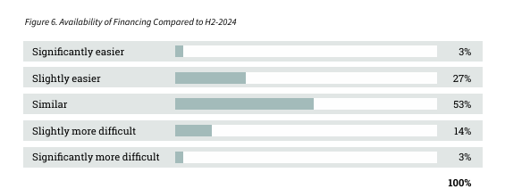 Looking ahead to the second half of 2025, respondents are split in their expectations for financing conditions. While 30% anticipate conditions to remain stable, a notable share foresee some degree of improvement (39%), and a slightly smaller group expect financing to become more challenging (31%).