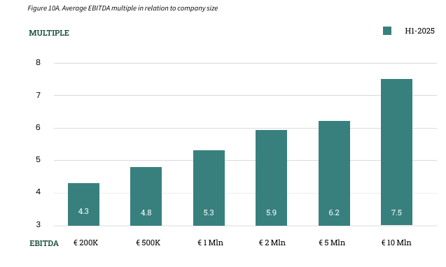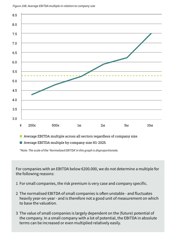 The difference in the EBITDA multiple between companies with a normalised EBITDA of €200,000 and €10,000,000 is 3.2 (4.3 compared to 7.5).