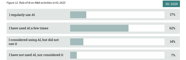 In the first half of 2025, AI has become a widely adopted tool in M&A activities across Southern Europe. 17% report using AI on a regular basis, while the majority of advisors have experimented with it a few times (62%). A smaller group (14%) have considered AI but not yet applied it, and only 7% have not engaged with it at all, underscoring that AI is now firmly embedded in the regional M&A landscape.