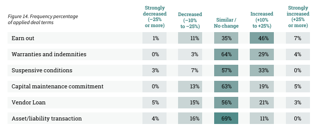 By contrast, vendor loans and capital maintenance commitments displayed a more balanced picture: a majority reported no change, while around a quarter indicated greater use. Asset/liability transactions, however, appeared the most stable, with nearly 70% noting no change and only limited signs of increase.