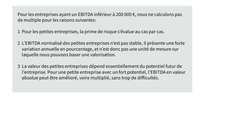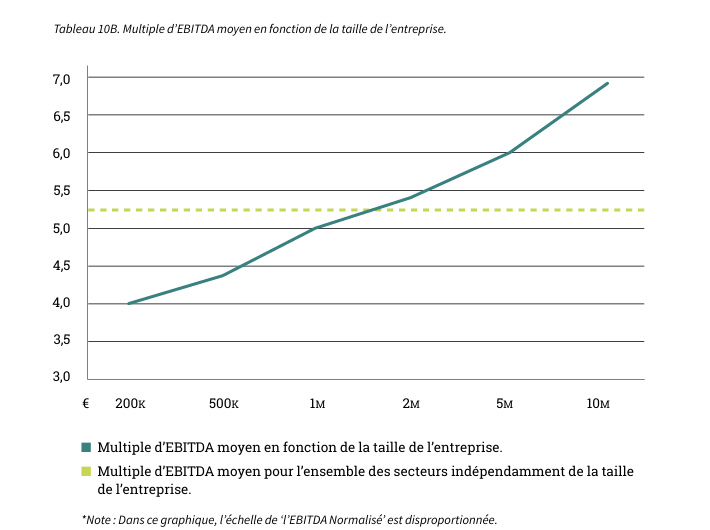 L’écart de multiple d’EBITDA entre les entreprises dont l’EBITDA normalisé est de 200 000 € et celles dont il atteint 10 000 000 € est de 2,9 (4 contre 6,9).