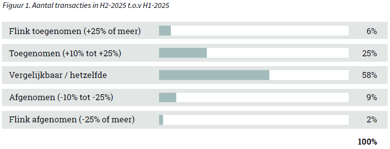 Een toename of afname van opdrachten bij advieskantoren geeft inzicht in de verwachte dealflow en marktsentiment. Na een relatief stabiele eerste jaarhelft laten de cijfers over H2-2025 een licht verschuivend beeld zien. De resultaten zijn weergegeven in onderstaande Figuur 5. Het betreft opdrachten die in de tweede helft van 2025 zijn binnengekomen en (deels) zijn doorvertaald naar transacties in diezelfde periode. In sommige gevallen zullen deze opdrachten pas in H1-2026 leiden tot een deal, of alsnog worden afgebroken.