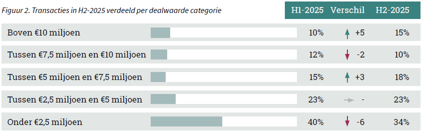 De verdeling van dealwaarden laat zien in welke mate kleine, middelgrote en grote transacties bijdragen aan de totale afgesloten transacties. In de tweede helft van 2025 is de gemiddelde dealwaarde opnieuw gestegen ten opzichte van de eerste helft van het jaar. Dit komt met name door een toename van het aantal grotere transacties: het aandeel deals boven €10 miljoen steeg met 5 procentpunt naar 15%. Ook het middensegment (€5–€7,5 miljoen) groeide (+3 procentpunt), terwijl het aandeel kleinere deals onder €2,5 miljoen met 6 procentpunt daalde.