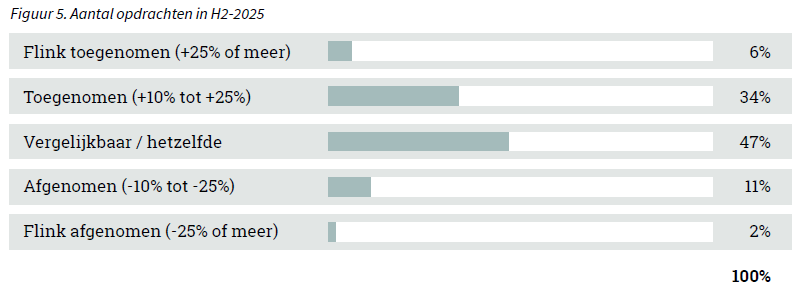 In H2-2025 rapporteren meer adviseurs een stijging in het aantal ontvangen opdrachten ten opzichte van H1-2025. Ruim een derde zag in de tweede helft van 2025 een toename, terwijl 47% een gelijkblijvend volume meldde. Slechts een klein deel van de adviseurs gaf aan in H2-2025 minder opdrachten te hebben ontvangen.