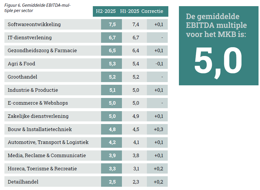 De gemiddelde EBITDA-multiple is in H2-2025 licht gestegen naar 5,0. Daarmee staat de nederlandse multiple op het hoogste niveau in jaren. De meeste sectorspecifieke multiples laten een stijging zien tussen 0,1 en 0,3. Alleen in de Agri & Food-sector is een daling van 0,1 in de gemiddelde EBITDA-multiple gerapporteerd.