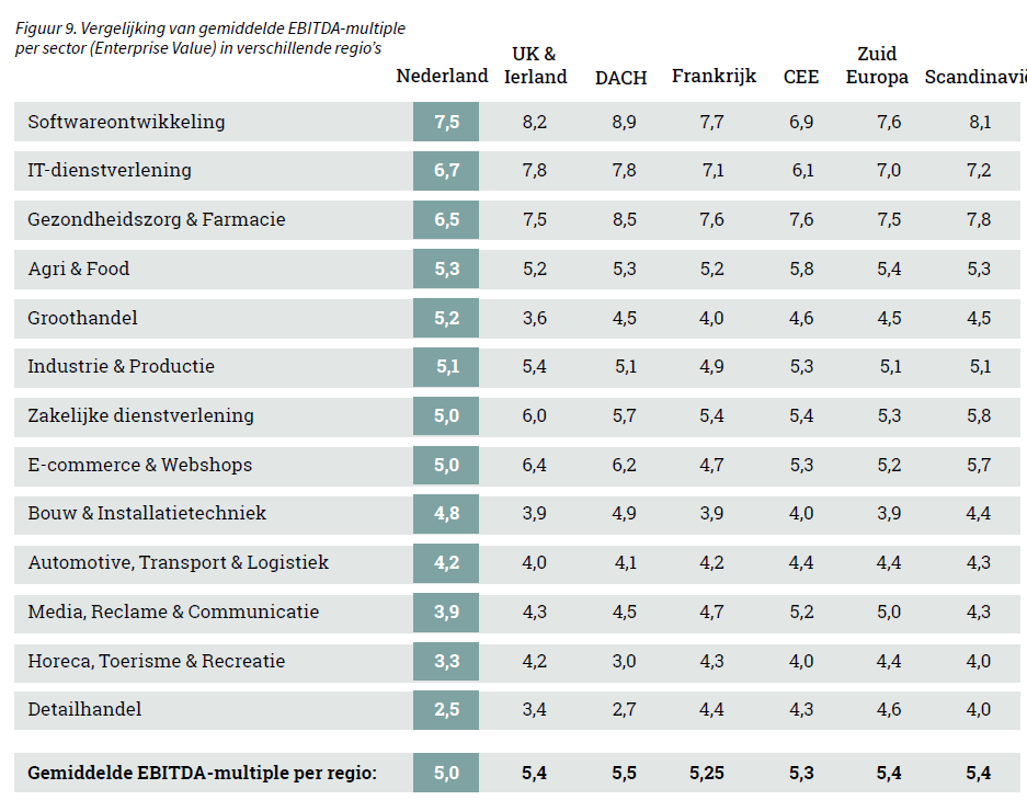 Het vergelijken van EBITDA-multiples per sector met die in andere landen biedt inzicht in internationale waarderingsniveaus en de concurrentiepositie van lokale markten. Zo kan het aantrekkelijk zijn om een onderneming in het buitenland over te nemen, of juist het eigen bedrijf te verkopen aan een buitenlandse koper. Figuur 9 toont de variaties in EBITDA-multiples binnen verschillende Europese markten.