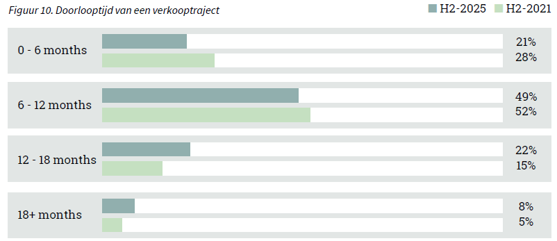 In H2-2025 duurde bijna de helft (49%) van de verkooptrajecten die zijn begeleid door een overnameadviseur tussen 6 en 12 maanden. Bij 30% van de begeleide trajecten duurde het verkoopproces langer dan een jaar. In H2-2021 was dit nog 20%, wat erop wijst dat verkooptrajecten vaker langer duren dan voorheen.