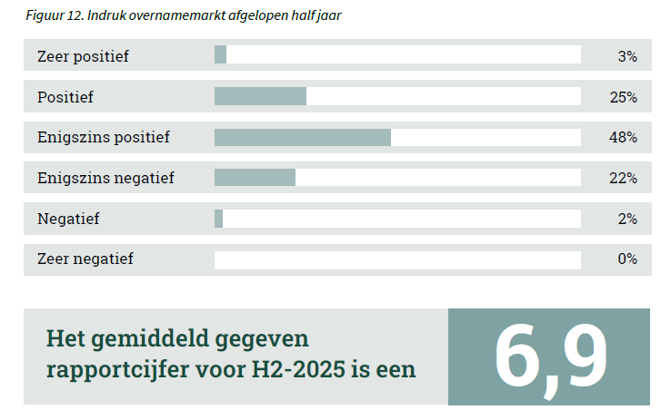 De outlook voor de MKB-overnamemarkt in Nederland is gebaseerd op veel factoren. De overname advieskantoren is gevraagd om hun verwachtingen voor H1-2026 weer te geven aan de hand van een rapportcijfer. Daarin wordt onder andere meegewogen: het aantal ondernemers dat hun bedrijf wil verkopen, het gemak van het verkrijgen van financiering en de macro-economische ontwikkelingen. Tevens is adviseurs gevraagd naar hun indruk van het afgelopen half jaar (H2-2025) en dit uit te drukken in een rapportcijfer. Het vergelijken van deze antwoorden geeft een reëel beeld van het vertrouwen van de adviseurs in de markt.