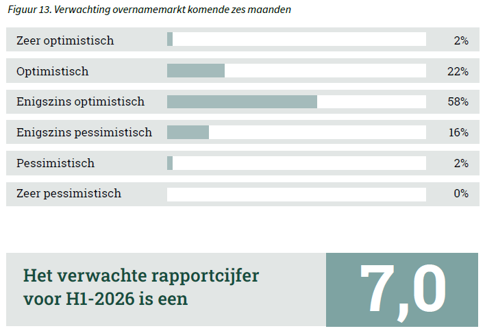 De verwachtingen voor H1-2026 zijn positief. 82% van de respondenten is optimistisch over het komende half jaar. Het verwachte rapportcijfer voor H1-2026 is een 7.