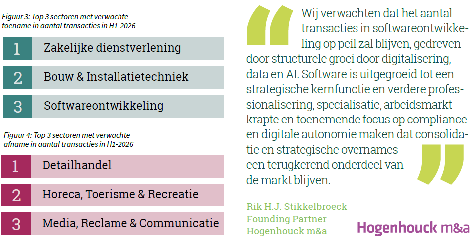 Het verwachte aantal transacties binnen sectoren wordt beïnvloed door diverse markt-, branche- en financieringsfactoren. Om inzicht te krijgen in de verwachte ontwikkelingen, is M&A-adviseurs gevraagd in welke sector zij in de eerste helft van 2026 de grootste toename of afname in dealactiviteit voorzien. Iedere respondent kon één sector aanwijzen. De uitkomsten zijn weergegeven in twee grafieken, waarin de drie sectoren zijn opgenomen die het vaakst werden genoemd voor respectievelijk een stijging en een daling van het aantal transacties.